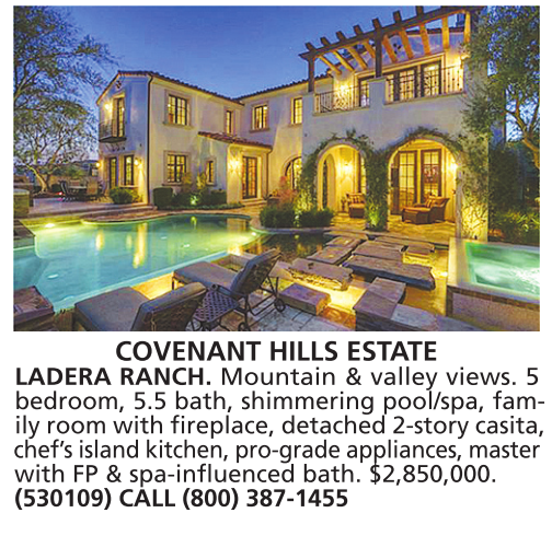 COVENANT HILLS ESTATE LADERA RANCH. Mountain & valley views. 5 bedroom, 5.5 bath, shimmering pool/spa, family room with fireplace, detached 2-story casita, chef’s island kitchen, pro-grade appliances, master with FP & spa-influenced bath. $2,850,000. (530109) CALL (800) 387-1455