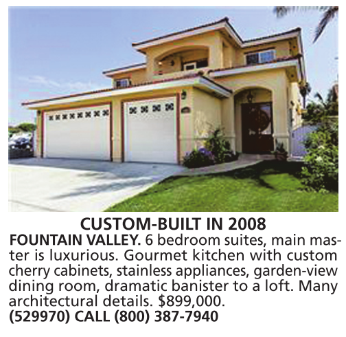 CUSTOM-BUILT IN 2008 FOUNTAIN VALLEY. 6 bedroom suites, main master is luxurious. Gourmet kitchen with custom cherry cabinets, stainless appliances, garden-view dining room, dramatic banister to a loft. Many architectural details. $899,000. (529970) CALL (800) 387-7940