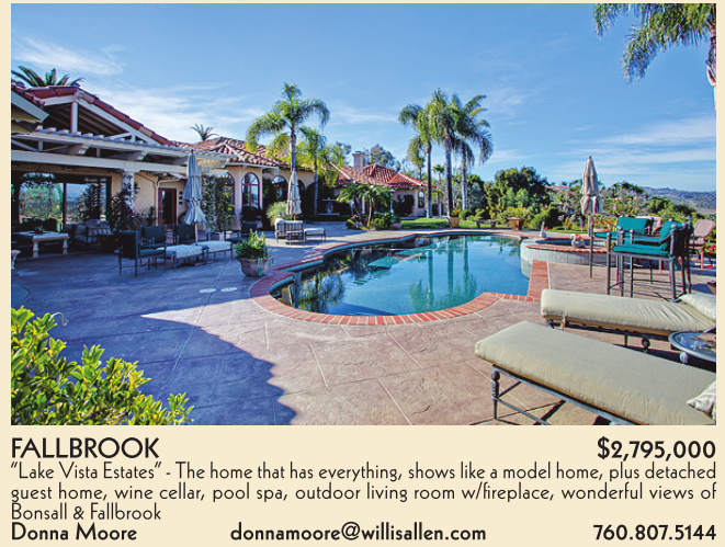FALLBROOK $2,795,000 “Lake Vista Estates” - The home that has everything, shows like a model home, plus detached guest home, wine cellar, pool spa, outdoor living room w/fi replace, wonderful views of Bonsall & Fallbrook Donna Moore donnamoore@willisallen.com 760.807.5144