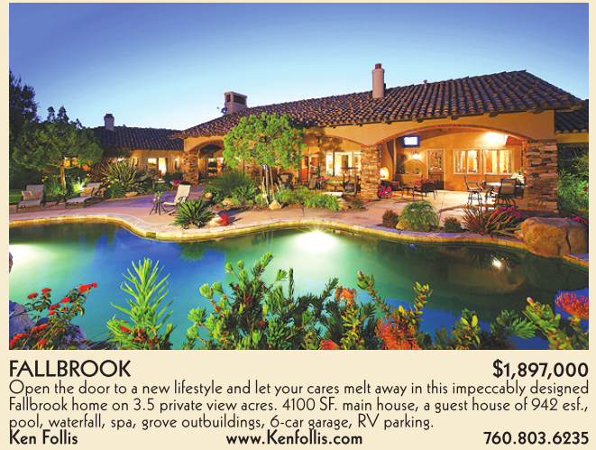 detached FALLBROOK $1,897,000 Open the door to a new lifestyle and let your cares melt away in this impeccably designed Fallbrook home on 3.5 private view acres. 4100 SF. main house, a guest house of 942 esf., pool, waterfall, spa, grove outbuildings, 6-car garage, RV parking. Ken Follis www.Kenfollis.com 760.803.6235