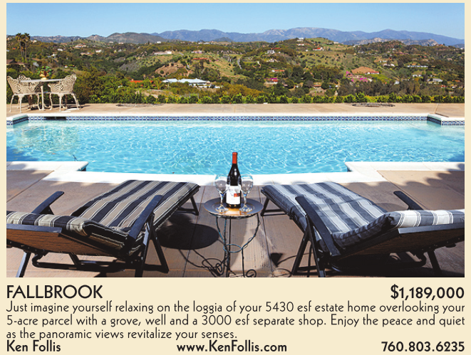 FALLBROOK $1,189,000 Just imagine yourself relaxing on the loggia of your 5430 esf estate home overlooking your 5-acre parcel with a grove, well and a 3000 esf separate shop. Enjoy the peace and quiet as the panoramic views revitalize your senses. Ken Follis www.KenFollis.com 760.803.6235
