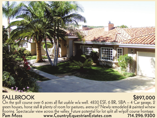 FALLBROOK $897,000 On the golf course over 6 acres all fl at usable w/a well. 4830 ESF, 6 BR, 5BA – 4 Car garage, 2 green houses, horse stall & plenty of room for pastures, arena or? Newly remodeled & painted w/new fl ooring. Spectacular view across the valley. Future potential for lot split all w/golf course frontage. Pam Moss www.CountryEquestrianEstates.com 714.296.9300