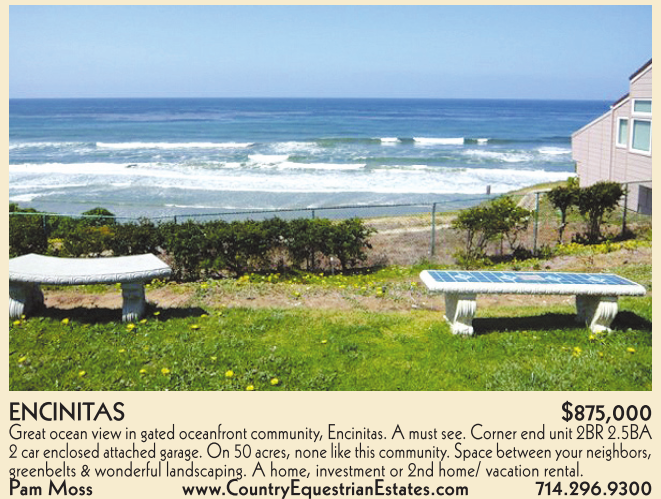 ENCINITAS $875,000 Great ocean view in gated oceanfront community, Encinitas. A must see. Corner end unit 2BR 2.5BA 2 car enclosed attached garage. On 50 acres, none like this community. Space between your neighbors, greenbelts & wonderful landscaping. A home, investment or 2nd home/ vacation rental. Pam Moss www.CountryEquestrianEstates.com 714.296.9300