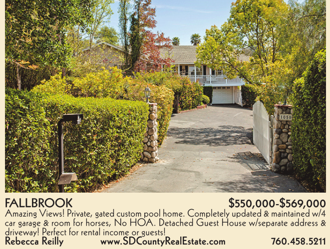 FALLBROOK $550,000-$569,000 Amazing Views! Private, gated custom pool home. Completely updated & maintained w/4 car garage & room for horses, No HOA. Detached Guest House w/separate address & driveway! Perfect for rental income or guests! Rebecca Reilly www.SDCountyRealEstate.com 760.458.5211