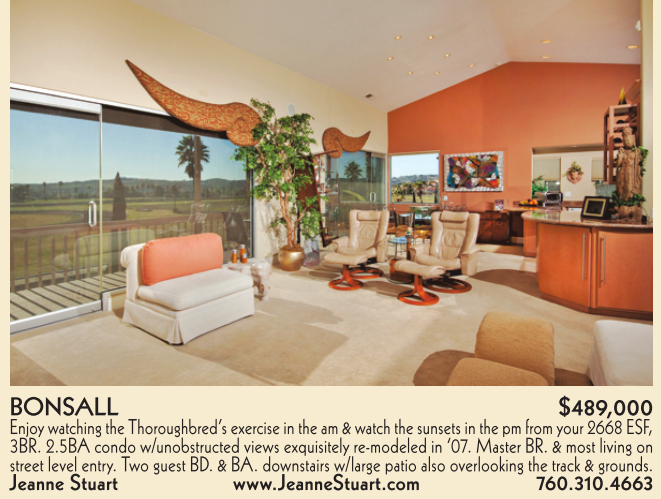 BONSALL $489,000 Enjoy watching the Thoroughbred’s exercise in the am & watch the sunsets in the pm from your 2668 ESF, 3BR. 2.5BA condo w/unobstructed views exquisitely re-modeled in ‘07. Master BR. & most living on street level entry. Two guest BD. & BA. downstairs w/large patio also overlooking the track & grounds. Jeanne Stuart www.JeanneStuart.com 760.310.4663