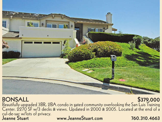 BONSALL $379,000 Beautifully upgraded 3BR, 2BA condo in gated community overlooking the San Luis Training Center. 2270 SF w/3 decks & views. Updated in 2000 & 2005. Located at the end of a cul-de-sac w/lots of privacy. Jeanne Stuart www.JeanneStuart.com 760.310.4663