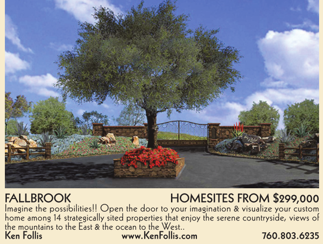FALLBROOK HOMESITES FROM $299,000 Imagine the possibilities!! Open the door to your imagination & visualize your custom home among 14 strategically sited properties that enjoy the serene countryside, views of the mountains to the East & the ocean to the West.. Ken Follis www.KenFollis.com 760.803.6235