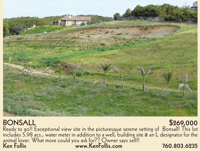 BONSALL $269,000 Ready to go!! Exceptional view site in the picturesque serene setting of Bonsall! This lot includes 5.98 acs., water meter in addition to a well, building site & an L designator for the animal lover. What more could you ask for?? Owner says sell!! Ken Follis www.KenFollis.com 760.803.6235