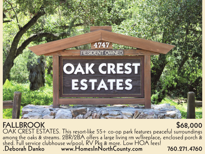 FALLBROOK $68,000 OAK CREST ESTATES. This resort-like 55+ co-op park features peaceful surroundings among the oaks & streams. 2BR/2BA offers a large living rm w/fi replace, enclosed porch & shed. Full service clubhouse w/pool, RV Pkg & more. Low HOA fees! .Deborah Danko www.HomesInNorthCounty.com 760.271.4760