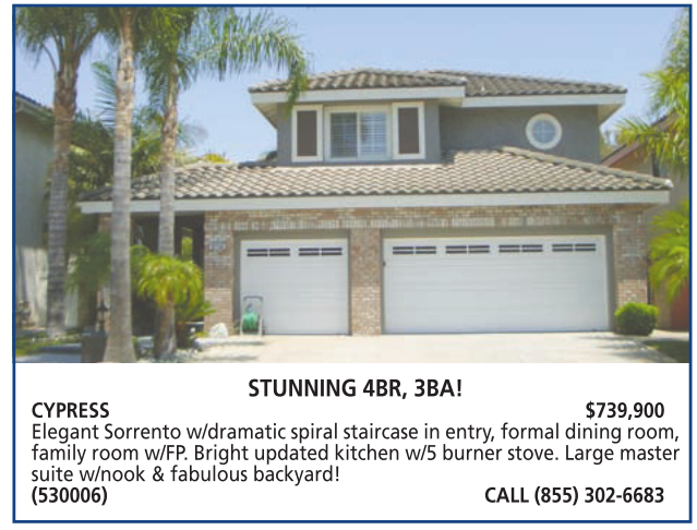 CYPRESS $739,900 Elegant Sorrento w/dramatic spiral staircase in entry, formal dining room, family room w/FP. Bright updated kitchen w/5 burner stove. Large master suite w/nook & fabulous backyard! (530006) CALL (855) 302-6683