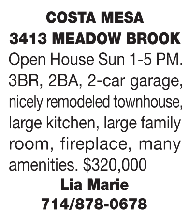 Open House Sun 1-5 PM. 3BR, 2BA, 2-car garage, nicely remodeled townhouse, large kitchen, large family room, fireplace, many amenities. $320,000