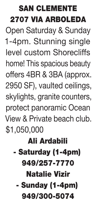 SAN CLEMENTE 2707 VIA ARBOLEDA Open Saturday & Sunday 1-4pm. Stunning single level custom Shorecliffs home! This spacious beauty offers 4BR & 3BA (approx. 2950 SF), vaulted ceilings, skylights, granite counters, protect panoramic Ocean View & Private beach club. $1,050,000 Ali Ardabili - Saturday (1-4pm) 949/257-7770 Natalie Vizir - Sunday (1-4pm) 949/300-5074