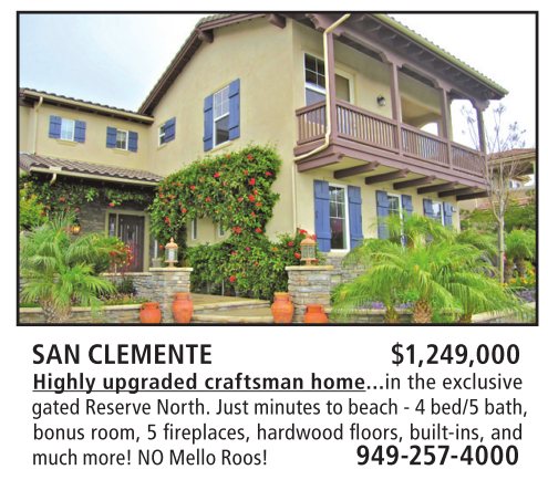 SAN CLEMENTE $1,249,000 Highly upgraded craftsman home...in the exclusive gated Reserve North. Just minutes to beach - 4 bed/5 bath, bonus room, 5 fi replaces, hardwood fl oors, built-ins, and much more! NO Mello Roos! 949-257-4000