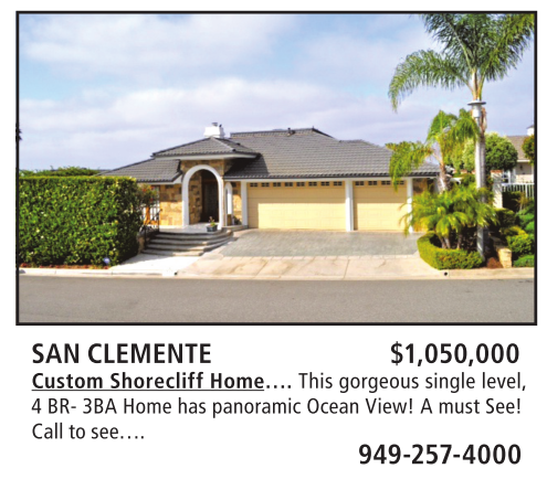 SAN CLEMENTE $1,050,000 Custom Shorecliff Home…. This gorgeous single level, 4 BR- 3BA Home has panoramic Ocean View! A must See! Call to see….