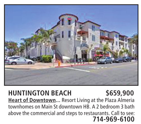 HUNTINGTON BEACH $659,900 Heart of Downtown... Resort Living at the Plaza Almeria townhomes on Main St downtown HB. A 2 bedroom 3 bath above the commercial and steps to restaurants. Call to see: