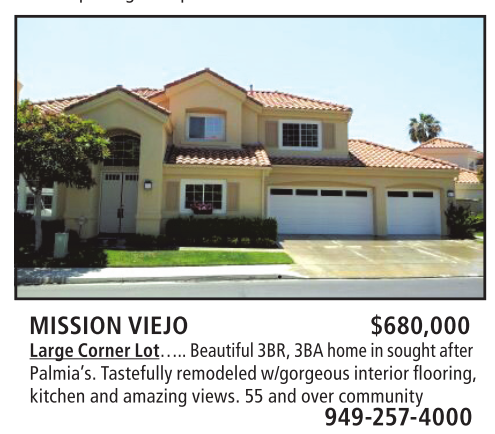 MISSION VIEJO $680,000 Large Corner Lot….. Beautiful 3BR, 3BA home in sought after Palmia’s. Tastefully remodeled w/gorgeous interior flooring, kitchen and amazing views. 55 and over community 949-257-4000