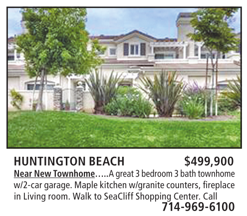 HUNTINGTON BEACH $499,900 Near New Townhome…..A great 3 bedroom 3 bath townhome w/2-car garage. Maple kitchen w/granite counters, fireplace in Living room. Walk to SeaCliff Shopping Center. Call 714-969-6100