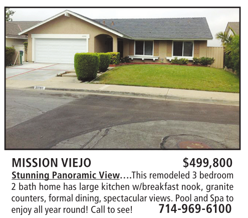 MISSION VIEJO $499,800 Stunning Panoramic View….This remodeled 3 bedroom 2 bath home has large kitchen w/breakfast nook, granite counters, formal dining, spectacular views. Pool and Spa to enjoy all year round! Call to see! 714-969-6100