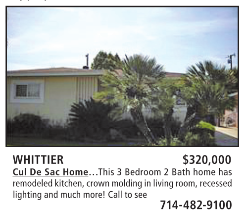 WHITTIER $320,000 Cul De Sac Home…This 3 Bedroom 2 Bath home has remodeled kitchen, crown molding in living room, recessed lighting and much more! Call to see 714-482-9100