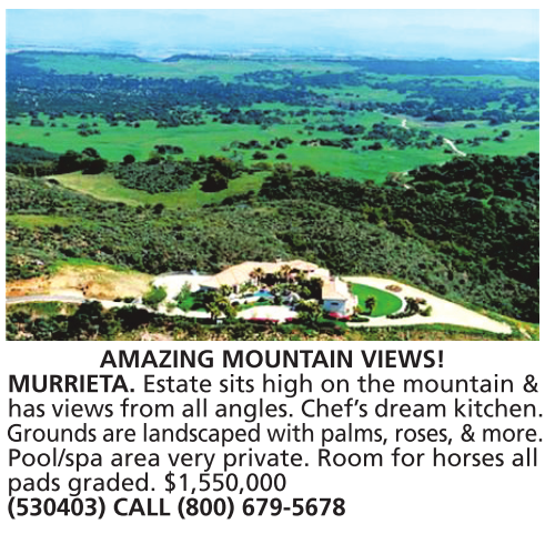 AMAZING MOUNTAIN VIEWS! MURRIETA. Estate sits high on the mountain & has views from all angles. Chef’s dream kitchen. Grounds are landscaped with palms, roses, & more. Pool/spa area very private. Room for horses all pads graded. $1,550,000 (530403) CALL (800) 679-5678