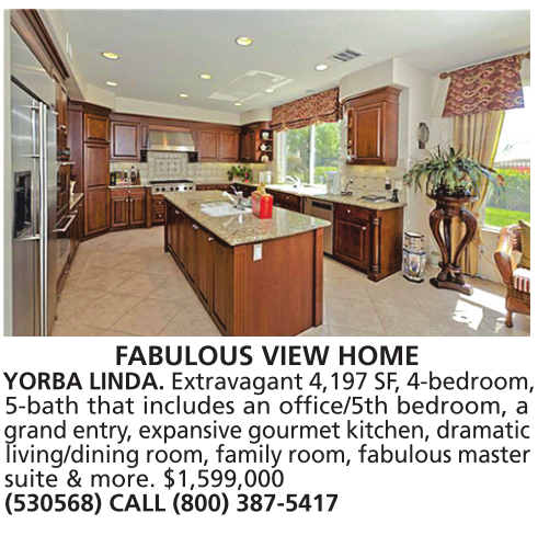 FABULOUS VIEW HOME YORBA LINDA. Extravagant 4,197 SF, 4-bedroom, 5-bath that includes an office/5th bedroom, a grand entry, expansive gourmet kitchen, dramatic living/dining room, family room, fabulous master suite & more. $1,599,000 (530568) CALL (800) 387-5417