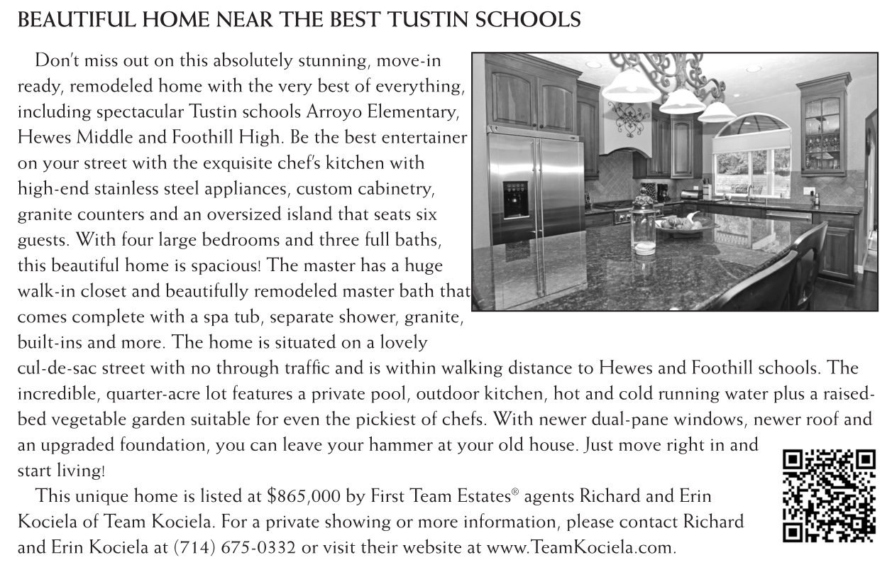 This unique home is listed at $865,000 by First Team Estates ® agents Richard and Erin Kociela of Team Kociela. For a private showing or more information, please contact Richard and Erin Kociela at (714) 675-0332 or visit their website at www.TeamKociela.com.