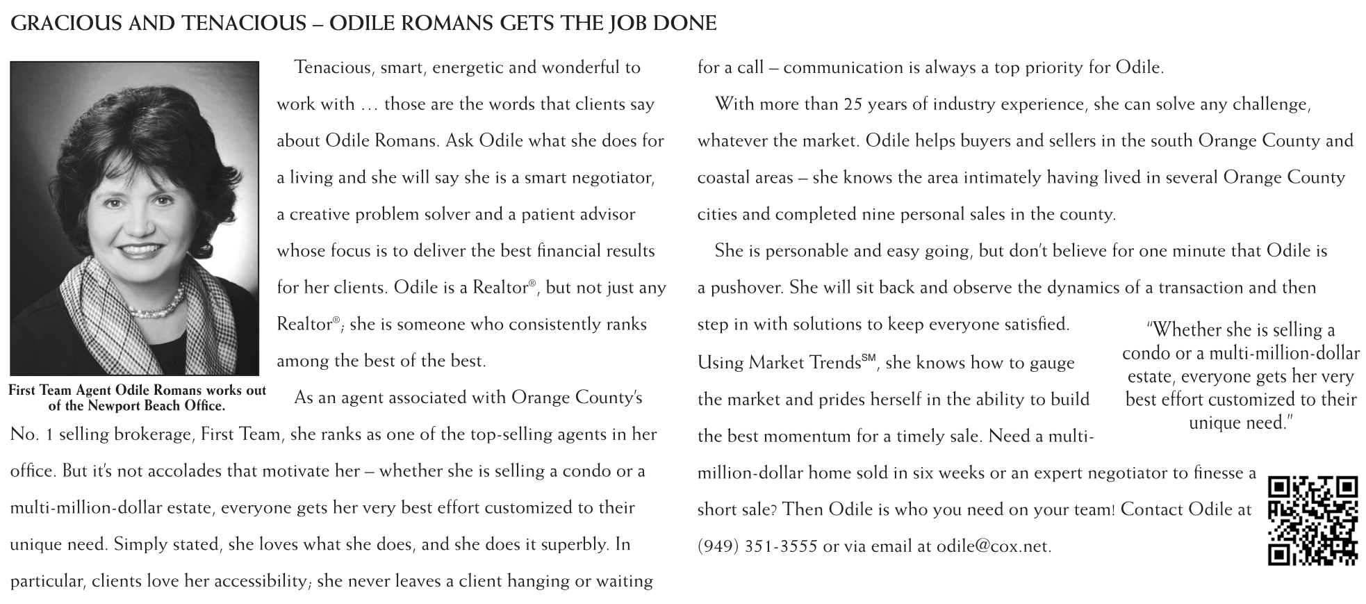 First Team Agent Odile Romans works out of the Newport Beach Office. As an agent associated with Orange County’s No. 1 selling brokerage, First Team, she ranks as one of the top-selling agents in her
