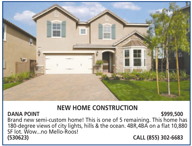 NEW HOME CONSTRUCTION DANA POINT $999,500 Brand new semi-custom home! This is one of 5 remaining. This home has 180-degree views of city lights, hills & the ocean. 4BR,4BA on a flat 10,880 SF lot. Wow...no Mello-Roos! (530623) CALL (855) 302-6683