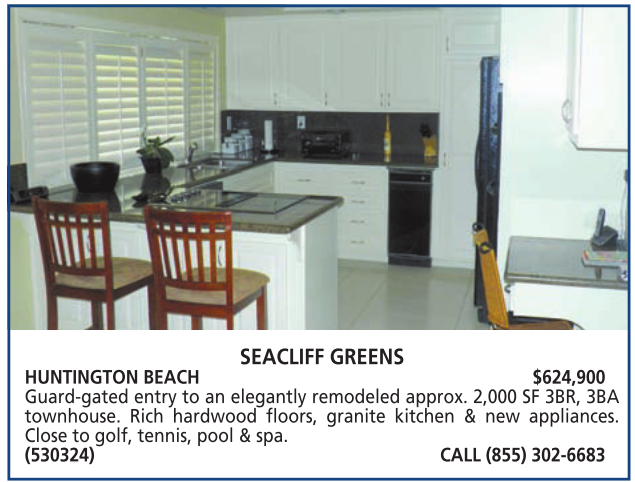 SEACLIFF GREENS HUNTINGTON BEACH $624,900 Guard-gated entry to an elegantly remodeled approx. 2,000 SF 3BR, 3BA townhouse. Rich hardwood floors, granite kitchen & new appliances. Close to golf, tennis, pool & spa. (530324) CALL (855) 302-6683