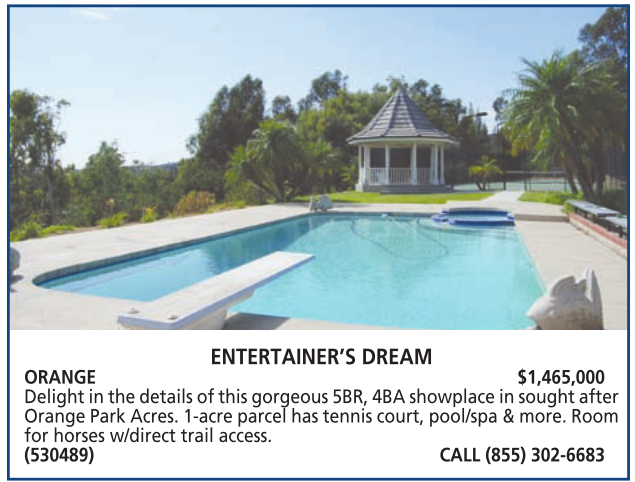 ENTERTAINER’S DREAM ORANGE $1,465,000 Delight in the details of this gorgeous 5BR, 4BA showplace in sought after Orange Park Acres. 1-acre parcel has tennis court, pool/spa & more. Room for horses w/direct trail access. (530489) CALL (855) 302-6683