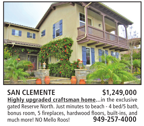 SAN CLEMENTE $1,249,000 Highly upgraded craftsman home...in the exclusive gated Reserve North. Just minutes to beach - 4 bed/5 bath, bonus room, 5 fi replaces, hardwood fl oors, built-ins, and much more! NO Mello Roos! 949-257-4000