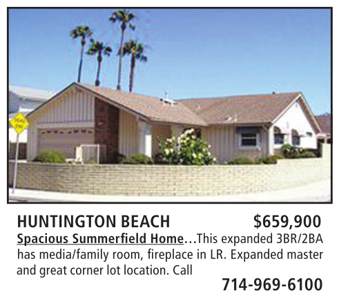 HUNTINGTON BEACH $659,900 Spacious Summerfield Home…This expanded 3BR/2BA has media/family room, fi replace in LR. Expanded master and great corner lot location. Call 714-969-6100
