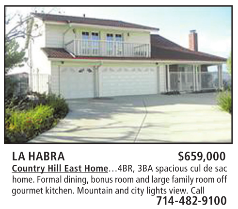LA HABRA $659,000 Country Hill East Home…4BR, 3BA spacious cul de sac home. Formal dining, bonus room and large family room off gourmet kitchen. Mountain and city lights view. Call 714-482-9100