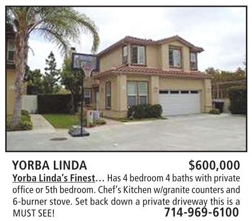 YORBA LINDA $600,000 Yorba Linda’s Finest… Has 4 bedroom 4 baths with private office or 5th bedroom. Chef’s Kitchen w/granite counters and 6-burner stove. Set back down a private driveway this is a MUST SEE! 714-969-6100