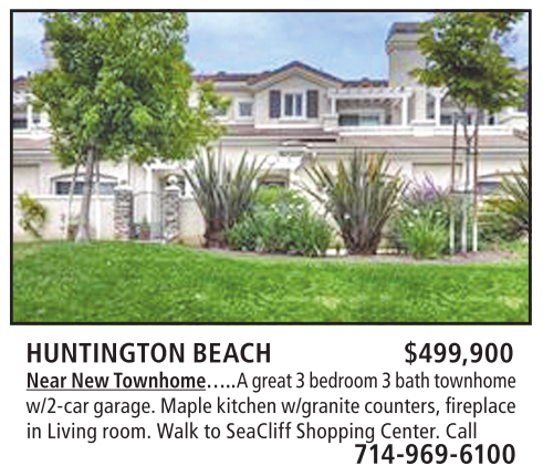 HUNTINGTON BEACH $499,900 Near New Townhome…..A great 3 bedroom 3 bath townhome w/2-car garage. Maple kitchen w/granite counters, fireplace in Living room. Walk to SeaCliff Shopping Center. Call 714-969-6100