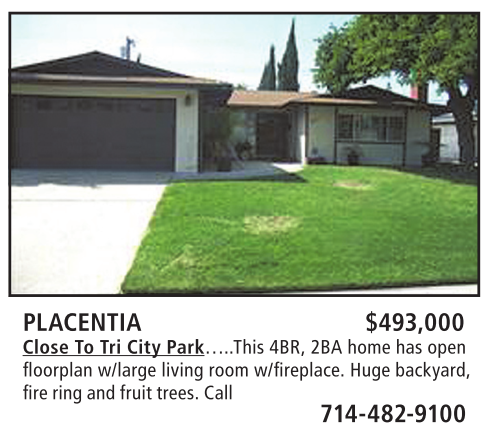 PLACENTIA $493,000 Close To Tri City Park…..This 4BR, 2BA home has open fl oorplan w/large living room w/fi replace. Huge backyard, fire ring and fruit trees. Call 714-482-9100