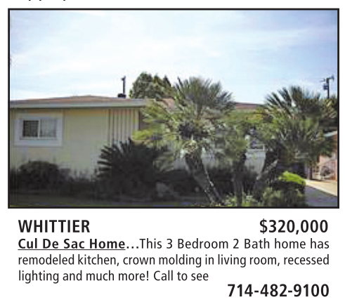 WHITTIER $320,000 Cul De Sac Home…This 3 Bedroom 2 Bath home has remodeled kitchen, crown molding in living room, recessed lighting and much more! Call to see 714-482-9100