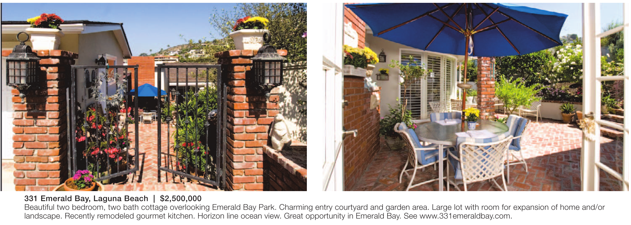 331 Emerald Bay, Laguna Beach | $2,500,000 Beautiful two bedroom, two bath cottage overlooking Emerald Bay Park. Charming entry courtyard and garden area. Large lot with room for expansion of home and/or landscape. Recently remodeled gourmet kitchen. Horizon line ocean view. Great opportunity in Emerald Bay. See www.331emeraldbay.com.