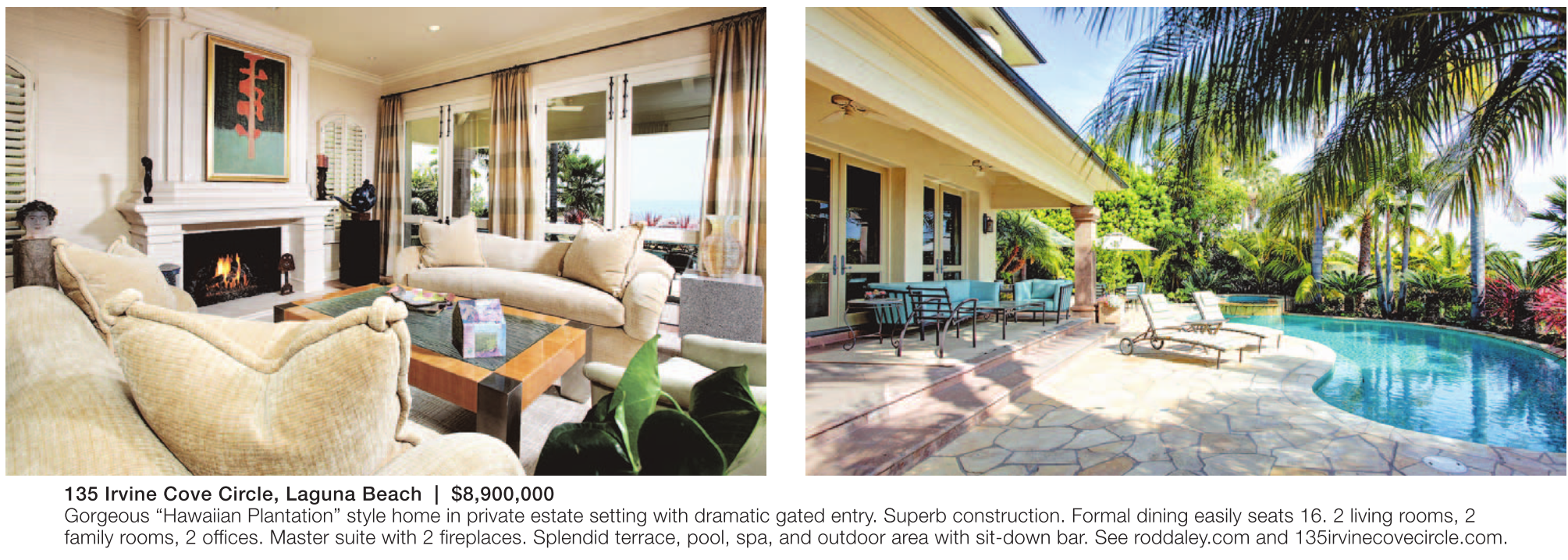 135 Irvine Cove Circle, Laguna Beach | $8,900,000 Gorgeous “Hawaiian Plantation” style home in private estate setting with dramatic gated entry. Superb construction. Formal dining easily seats 16. 2 living rooms, 2 family rooms, 2 offices. Master suite with 2 fireplaces. Splendid terrace, pool, spa, and outdoor area with sit-down bar. See roddaley.com and 135irvinecovecircle.com.