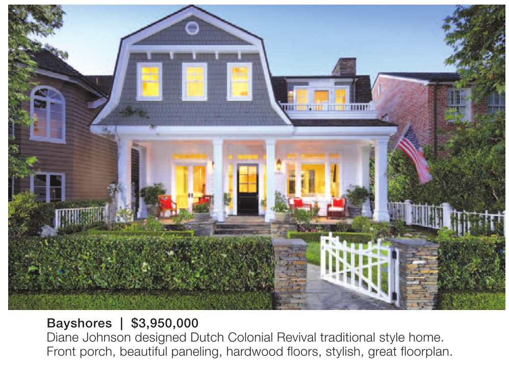 Bayshores | $3,950,000 Diane Johnson designed Dutch Colonial Revival traditional style home. Front porch, beautiful paneling, hardwood floors, stylish, great floorplan.