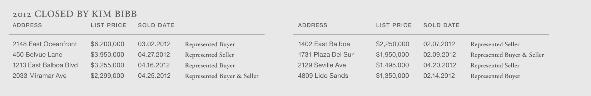 2148 East Oceanfront $6,200,000 03.02.2012 Represented Buyer 450 Belvue Lane $3,950,000 04.27.2012 Represented Seller 1213 East Balboa Blvd $3,255,000 04.16.2012 Represented Buyer 2033 Miramar Ave $2,299,000 04.25.2012 Represented Buyer & Seller