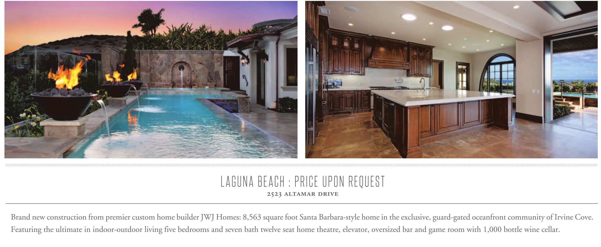 LAGUNA BEACH : PRICE UPON REQUEST 2523 altamar drive Brand new construction from premier custom home builder JWJ Homes: 8,563 square foot Santa Barbara-style home in the exclusive, guard-gated oceanfront community of Irvine Cove. Featuring the ultimate in indoor-outdoor living five bedrooms and seven bath twelve seat home theatre, elevator, oversized bar and game room with 1,000 bottle wine cellar.
