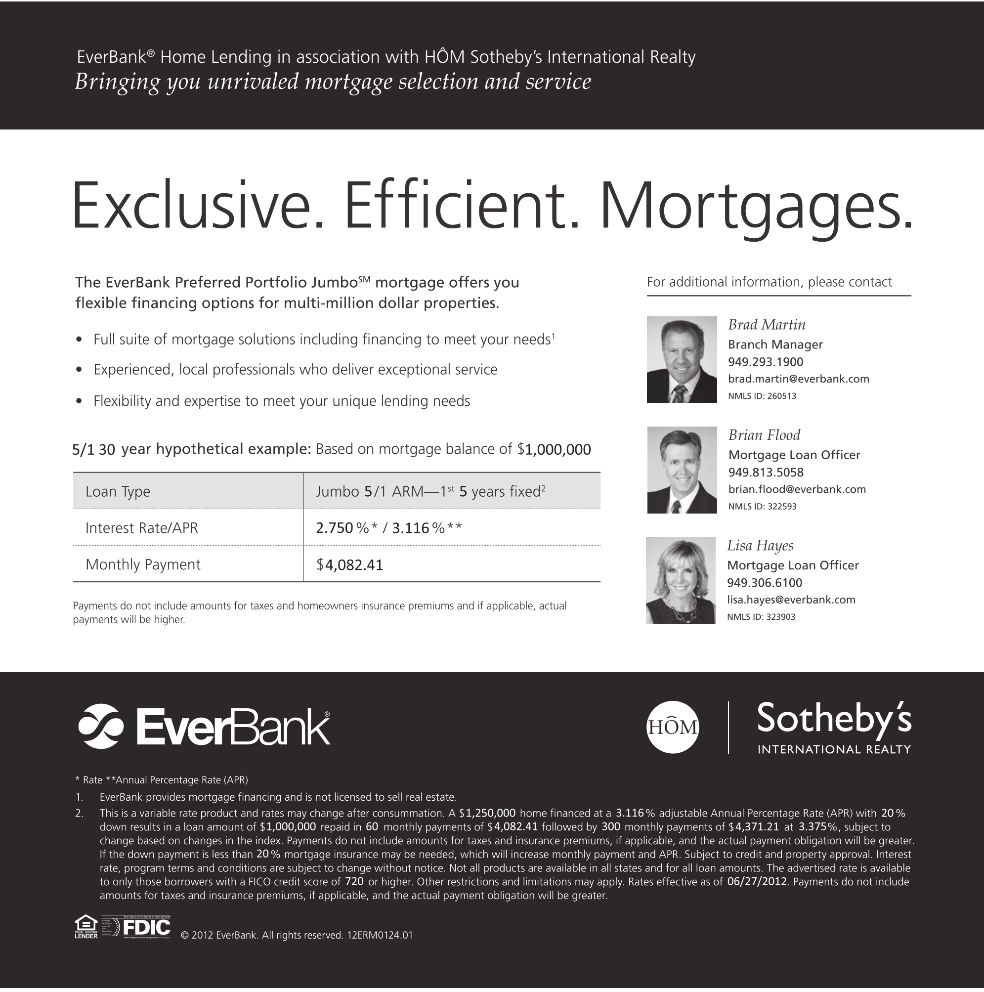 * Rate **Annual Percentage Rate (APR) 1. EverBank provides mortgage financing and is not licensed to sell real estate. 2. This is a variable rate product and rates may change after consummation. A $ 1,250,000 home financed at a 3.116% adjustable Annual Percentage Rate (APR) with 20 % down results in a loan amount of $ 1,000,000 repaid in 60 monthly payments of $ 4,082.41 followed by 300 monthly payments of $ 4,371.21 at 3.375%, subject to change based on changes in the index. Payments do not include amounts for taxes and insurance premiums, if applicable, and the actual payment obligation will be greater. If the down payment is less than 20% mortgage insurance may be needed, which will increase monthly payment and APR. Subject to credit and property approval. Interest rate, program terms and conditions are subject to change without notice. Not all products are available in all states and for all loan amounts. The advertised rate is available to only those borrowers with a FICO credit score of 720 or higher. Other restrictions and limitations may apply. Rates effective as of 06/27/2012. Payments do not include amounts for taxes and insurance premiums, if applicable, and the actual payment obligation will be greater.
