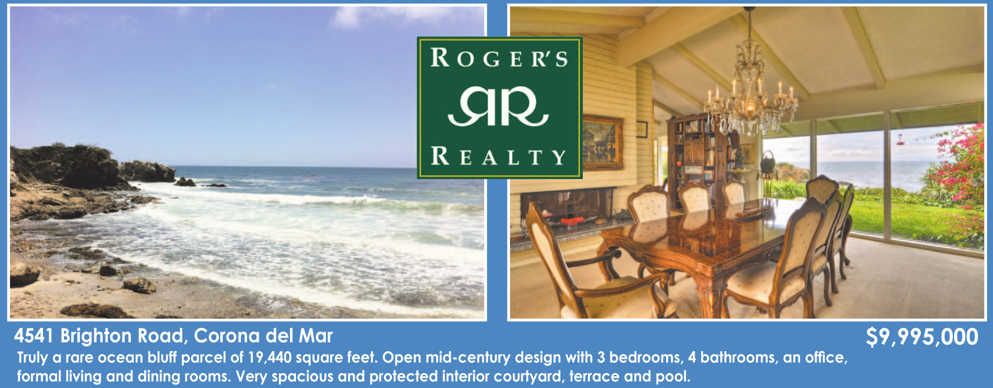 4541 Brighton Road, Corona del Mar Truly a rare ocean bluff parcel of 19,440 square feet. Open mid-century design with 3 bedrooms, 4 bathrooms, an office, formal living and dining rooms. Very spacious and protected interior courtyard, terrace and pool. $9,995,000