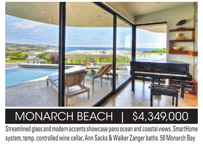 Streamlined glass and modern accents showcase pano ocean and coastal views. SmartHome system, temp. controlled wine cellar, Ann Sacks & Walker Zanger baths. 50 Monarch Bay