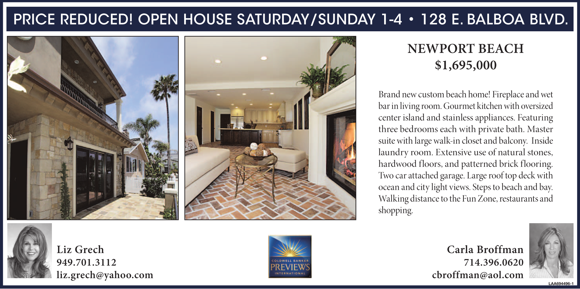 PRICE REDUCED! OPEN HOUSE SATURDAY/SUNDAY 1-4 • 128 E. BALBOA BLVD. NEWPORT BEACH $1,695,000 Brand new custom beach home! Fireplace and wet bar in living room. Gourmet kitchen with oversized center island and stainless appliances. Featuring three bedrooms each with private bath. Master suite with large walk-in closet and balcony. Inside laundry room. Extensive use of natural stones, hardwood floors, and patterned brick flooring. Two car attached garage. Large roof top deck with ocean and city light views. Steps to beach and bay. Walking distance to the Fun Zone, restaurants and shopping. Liz Grech 949.701.3112 liz.grech@yahoo.com Carla Broffman 714.396.0620 cbroffman@aol.com LAA694496-1