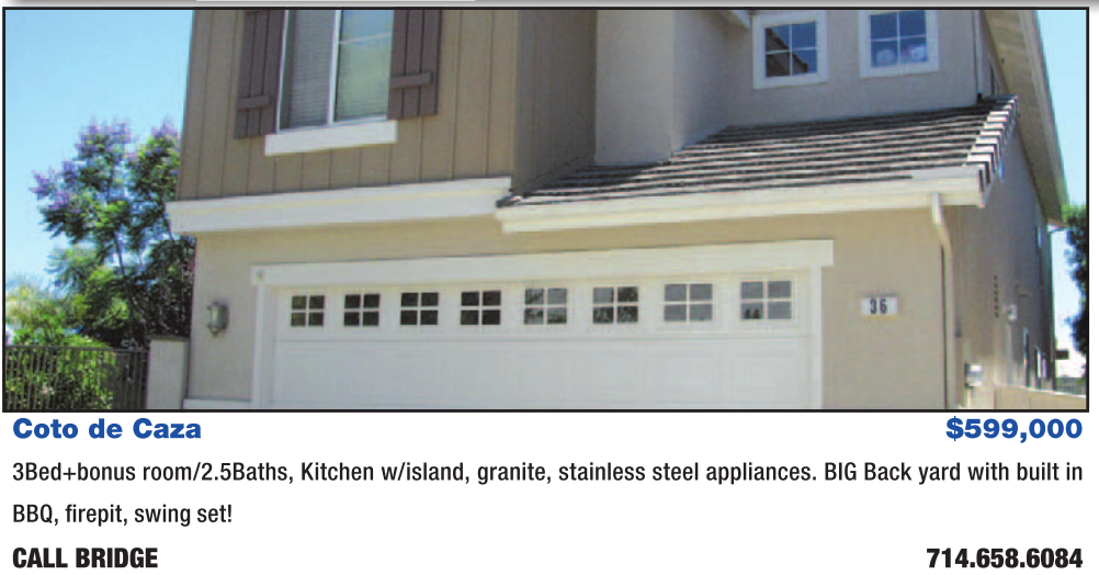 Coto de Caza $599,000 3Bed+bonus room/2.5Baths, Kitchen w/island, granite, stainless steel appliances. BIG Back yard with built in BBQ, firepit, swing set! CALL BRIDGE 714.658.6084