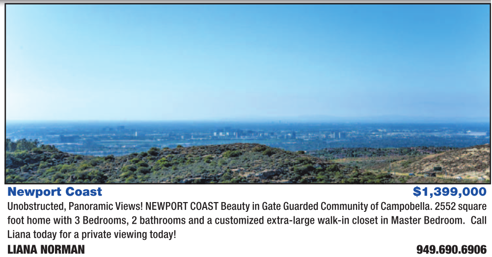 Newport Coast $1,399,000 Unobstructed, Panoramic Views! NEWPORT COAST Beauty in Gate Guarded Community of Campobella. 2552 square foot home with 3 Bedrooms, 2 bathrooms and a customized extra-large walk-in closet in Master Bedroom. Call Liana today for a private viewing today! LIANA NORMAN 949.690.6906