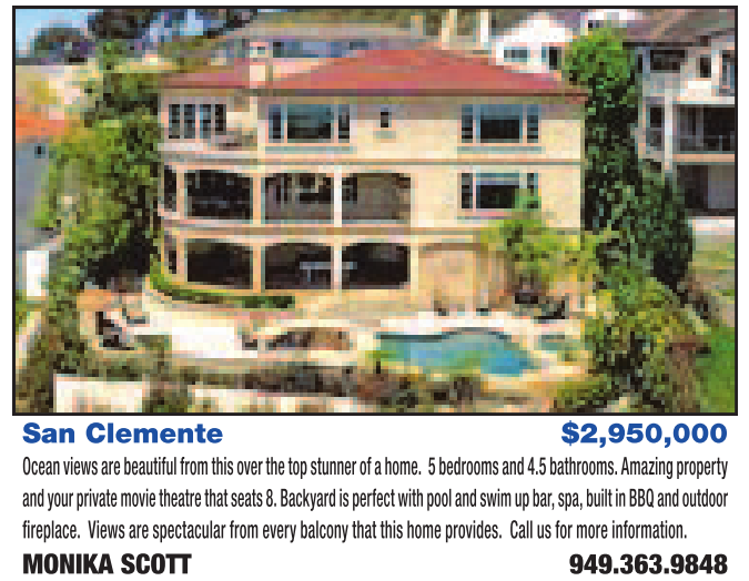 San Clemente $2,950,000 Ocean views are beautiful from this over the top stunner of a home. 5 bedrooms and 4.5 bathrooms. Amazing property and your private movie theatre that seats 8. Backyard is perfect with pool and swim up bar, spa, built in BBQ and outdoor fireplace. Views are spectacular from every balcony that this home provides. Call us for more information. MONIKA SCOTT 949.363.9848