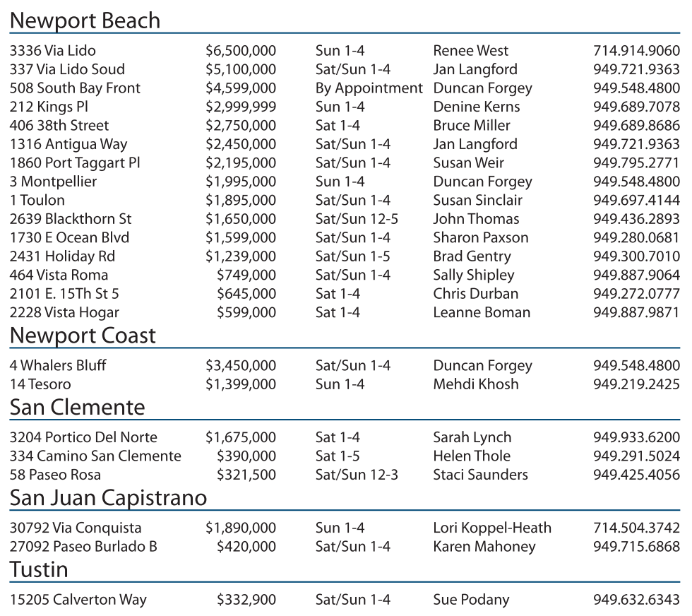 3336 Via Lido $6,500,000 Sun 1-4 Renee West 714.914.9060 337 Via Lido Soud $5,100,000 Sat/Sun 1-4 Jan Langford 949.721.9363 508 South Bay Front $4,599,000 By Appointment Duncan Forgey 949.548.4800 212 Kings Pl $2,999,999 Sun 1-4 Denine Kerns 949.689.7078 406 38th Street $2,750,000 Sat 1-4 Bruce Miller 949.689.8686 1316 Antigua Way $2,450,000 Sat/Sun 1-4 Jan Langford 949.721.9363 1860 Port Taggart Pl $2,195,000 Sat/Sun 1-4 Susan Weir 949.795.2771 3 Montpellier $1,995,000 Sun 1-4 Duncan Forgey 949.548.4800 1 Toulon $1,895,000 Sat/Sun 1-4 Susan Sinclair 949.697.4144 2639 Blackthorn St $1,650,000 Sat/Sun 12-5 John Thomas 949.436.2893 1730 E Ocean Blvd $1,599,000 Sat/Sun 1-4 Sharon Paxson 949.280.0681 2431 Holiday Rd $1,239,000 Sat/Sun 1-5 Brad Gentry 949.300.7010 464 Vista Roma $749,000 Sat/Sun 1-4 Sally Shipley 949.887.9064 2101 E. 15Th St 5 $645,000 Sat 1-4 Chris Durban 949.272.0777 2228 Vista Hogar $599,000 Sat 1-4 Leanne Boman 949.887.9871 Newport Coast 4 Whalers Bluff $3,450,000 Sat/Sun 1-4 Duncan Forgey 949.548.4800 14 Tesoro $1,399,000 Sun 1-4 Mehdi Khosh 949.219.2425